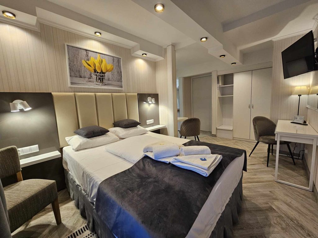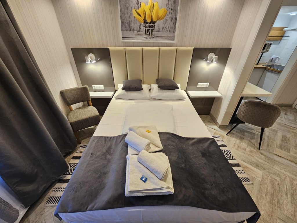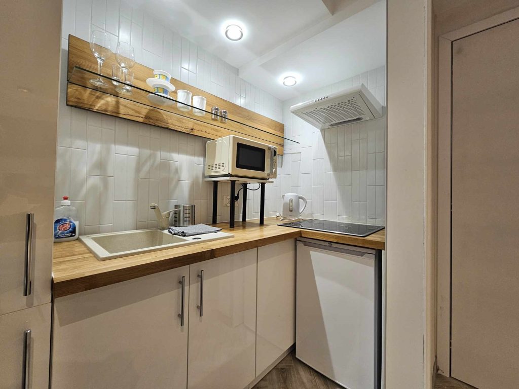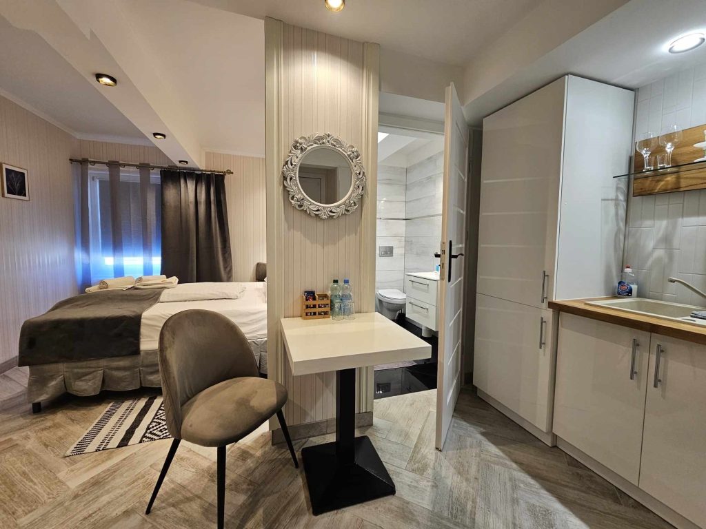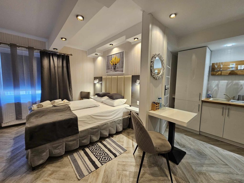 Wygodny apartament studio dla 2 osób z aneksem kuchennym i łazienką.