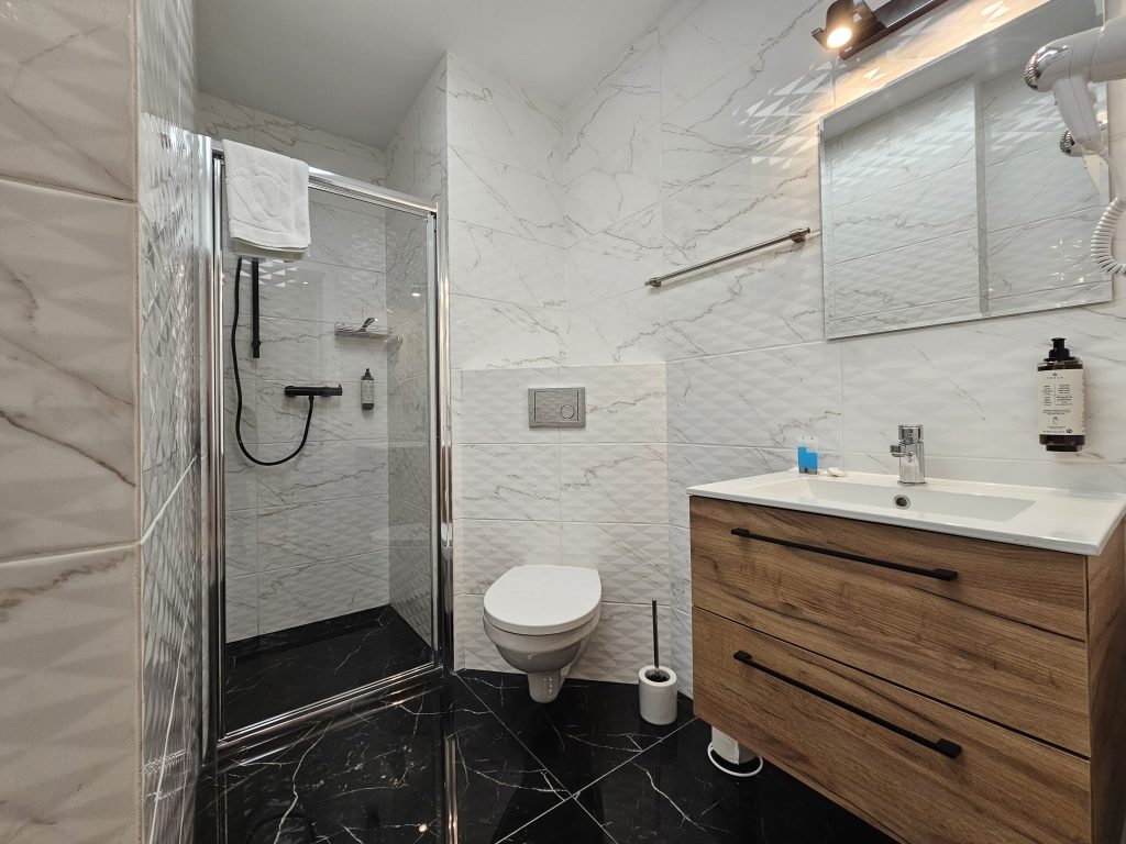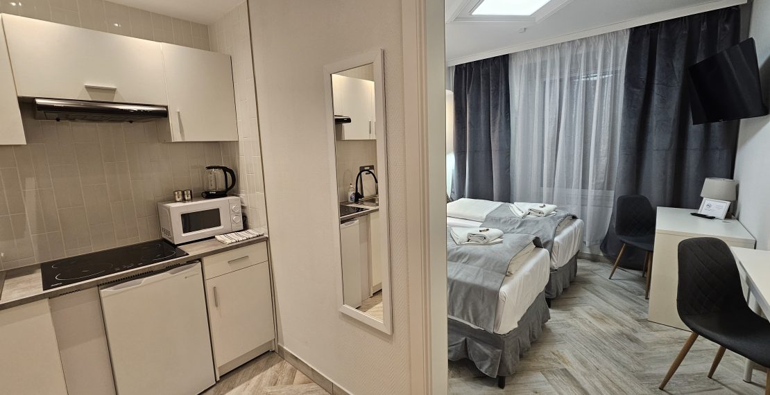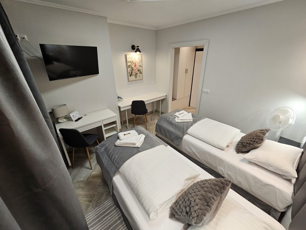 Apartament dla 2 osób z aneksem kuchennym i łązienką i 2 łóżkami pojedynczymi.