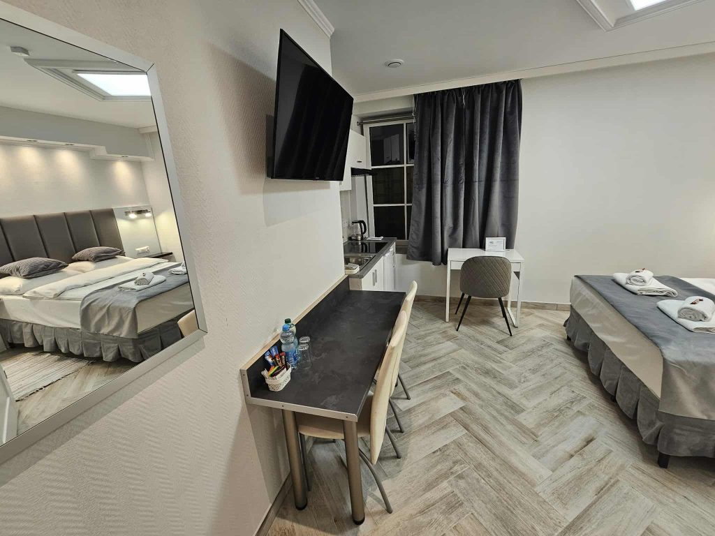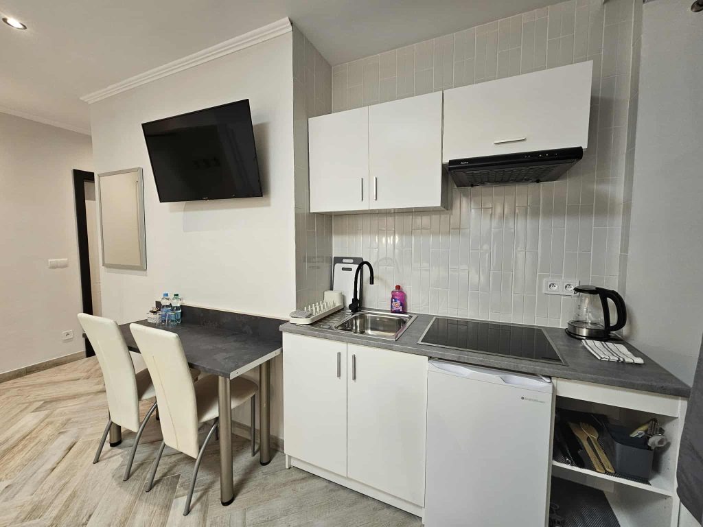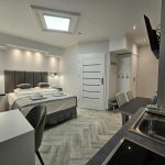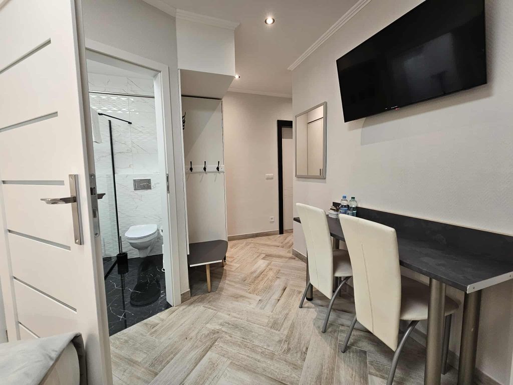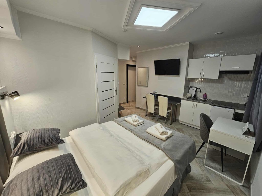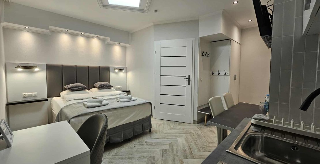 Wygodny apartament studio dla 2 osób z aneksem kuchennym i łazienką.